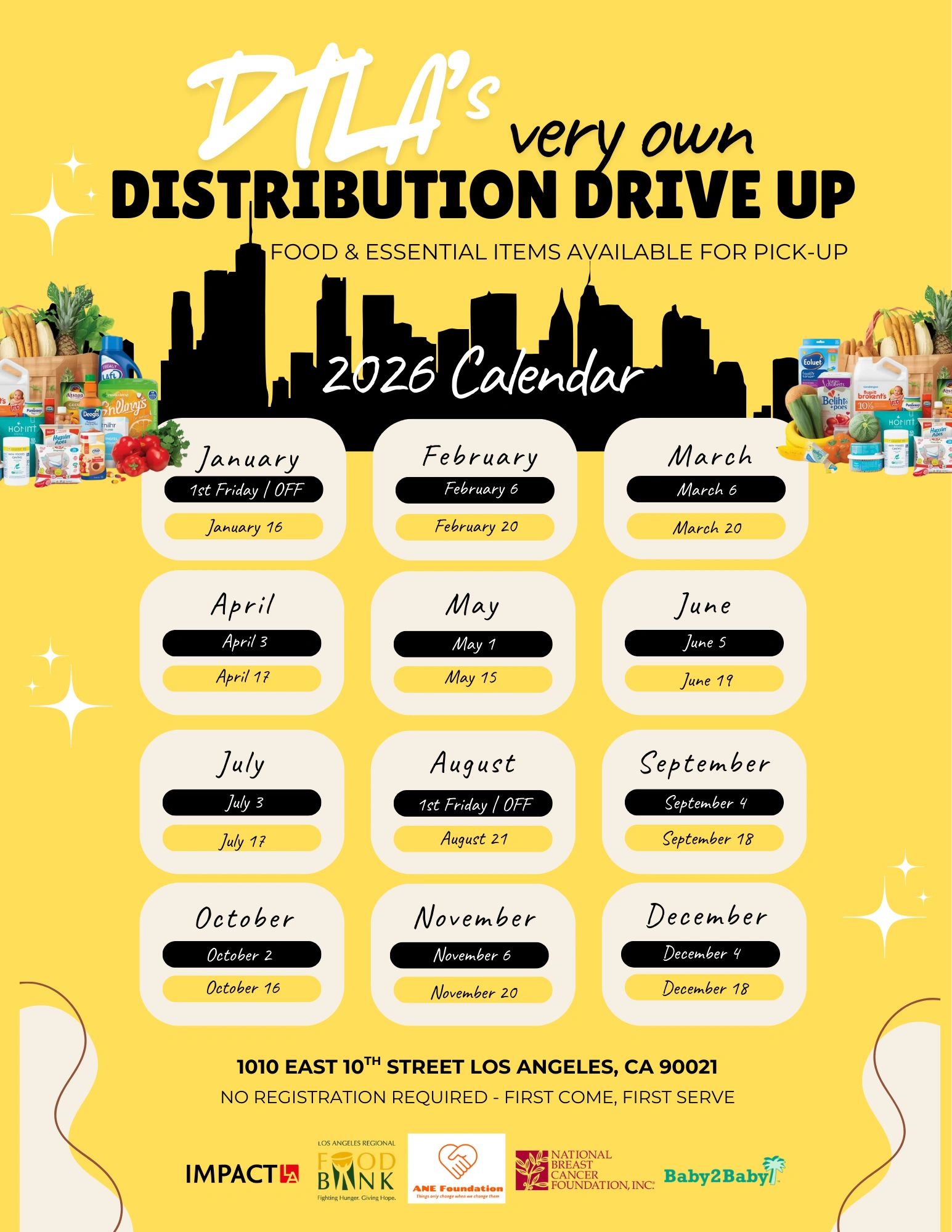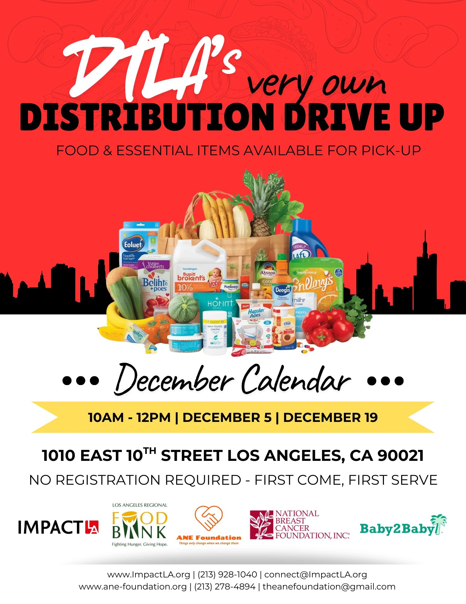 Pull up and pop your trunk! Impact LA and partners are hosting a free drive-thru grocery distribution in the heart of Downtown LA—providing fresh produce, pantry goods, and essentials to local families in need. Stay in your vehicle while our volunteers load your groceries safely and efficiently. First come, first served while supplies last!